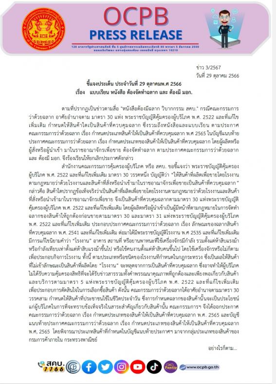 ชี้แจงประเด็น ประจำวันที่ 29 ตุลาคมพ.ศ 2566 เรื่อง แบบเรียน หนังสือ ต้องจัดทำฉลาก และ ต้องมี มอก.