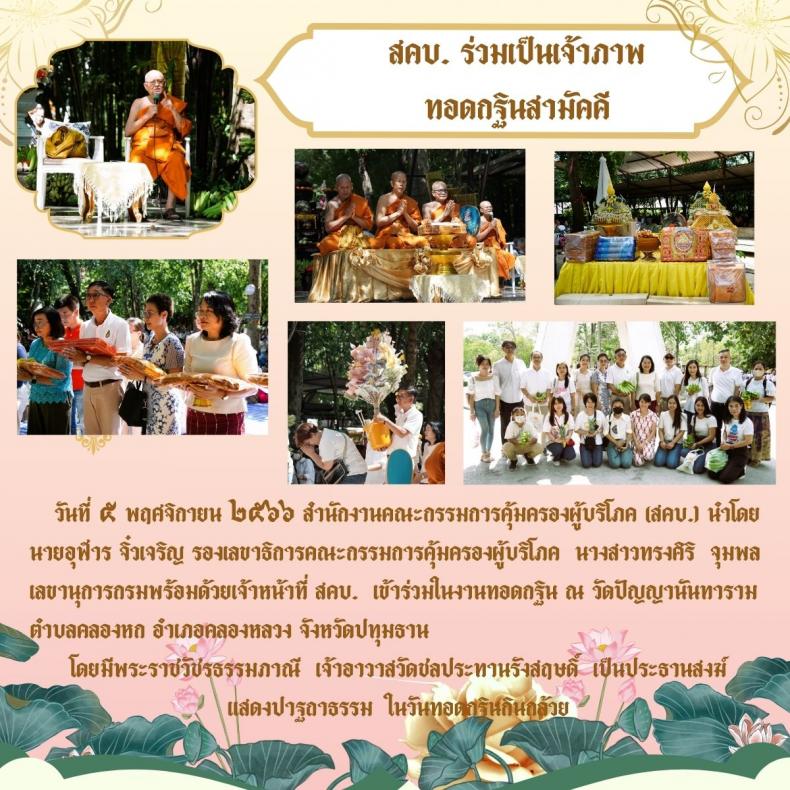 วันที่ ๕ พฤศจิกายน ๒๕๖๖ สำนักงานคณะกรรมการคุ้มครองผู้บริโภค (สคบ.) นำโดย นายอุฬาร จิ๋วเจริญ รองเลขาธิการคณะกรรมการคุ้มครองผู้บริโภค นางสาวทรงศิริ จุมพล เลขานุการกรม พร้อมด้วยเจ้าหน้าที่ สคบ. เข้าร่วมในงานทอดกฐิน ณ วัดปัญญานันทาราม ตำบลคลองหก อำเภอคลองหลวง จังหวัดปทุมธานี