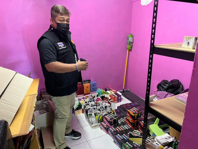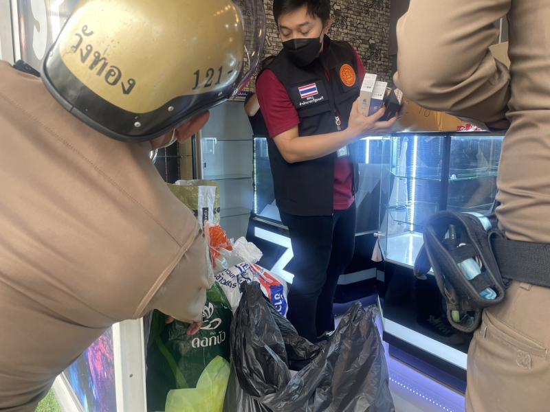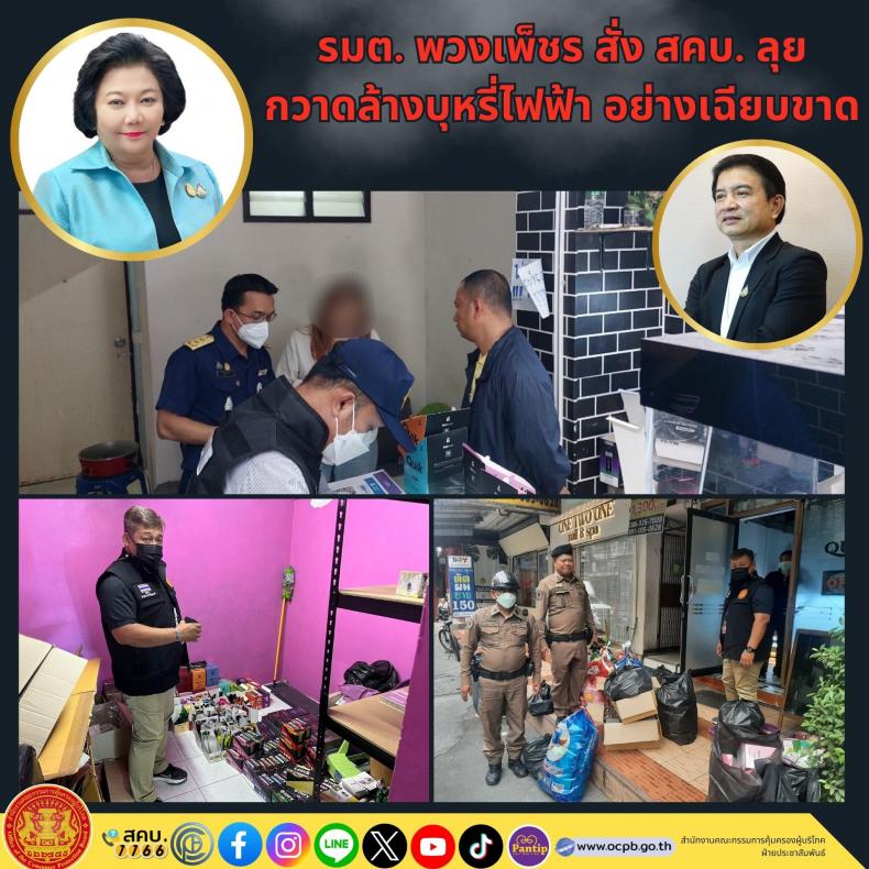 วันนี้  (29 ม.ค. 66 )  ดร.พวงเพ็ชร ชุนละเอียด รัฐมนตรีประจำสำนักนายกรัฐมนตรี สั่งการให้ สคบ. ลงพื้นที่กวาดล้างร้านลักลอบขายบุหรี่ไฟฟ้า ย่านรามคำแหง อย่างเฉียบขาด เพื่อปกป้องคุ้มครองผู้บริโภค โดยเฉพาะกลุ่มเด็ก และเยาวชน  โดยนายธสรณ์อัฑฒ์ ธนิทธิพันธ์ เลขาสคบ. มอบหมายให้ศูนย์ปฏิบัติพิเศษ สคบ. นำโดยนายเลิศศักดิ์ รักธรรม ผอ.ส่วนบังคับคดี พร้อมเจ้าหน้าที่สคบ. ร่วมกับสถานีตำรวจนครบาลวังทองหลาง เข้าตรวจค้นภายใต้การอำนวยการโดย พ.ต.อ. เจษฎา ยางนอก ผกก. สน. วังทองหลาง รวม 12 นาย กรณีได้มีประชาชนร้องเรียนมีการเปิดร้านลักลอบขายบุหรี่ไฟฟ้า น้ำยาบุหรี่ไฟฟ้า มีเด็กและเยาวชนไปซื้อมาสูบจำนวนมาก เมื่อเจ้าหน้าที่เดินทางไปถึง บริเวณซอยรามคำแหง ลงพื้นที่ตรวจสอบร้านที่ 1 ร้าน Space pod รามคำแหง 65   ร้านที่ 2 ร้าน Queen vepe cafe และ ร้านที่ 3 ร้าน Daily Club  ลาดพร้าว 107  พบว่ามีการขายจริง เจ้าหน้าที่จึงได้แสดงตนกับเจ้าของร้านและยึดบุหรี่ไฟฟ้า น้ำยาบุหรี่ไฟฟ้าพร้อมพยานหลักฐานทั้งหมด เพื่อดำเนินคดีกับผู้ขายและบุคคลอื่นที่เกี่ยวข้องทั้งหมด ทางด้านนายธสรณ์อัฑฒ์ ธนิทธิพันธ์ เลขาสคบ. กล่าวว่า ปัญหาการลักลอบขายบุหรี่ไฟฟ้า น้ำยาบุหรี่ไฟฟ้า ที่เป็นปัญหาอยู่ในขณะนี้ทางคณะกรรมการคุ้มครองผู้บริโภค ซึ่งมีดร.พวงเพ็ชร ชุนละเอียด รัฐมนตรีประจำสำนักนายกรัฐมนตรี เป็นประธาน ได้แสดงความห่วงใยปัญหาบุหรี่ไฟฟ้าโดยเฉพาะอย่างยิ่งในกลุ่มเด็กและเยาวชน ที่ส่งผลเสียและเป็นอันตรายต่อสุขภาพ จึงให้สคบ.บูรณาการร่วมกับหน่วยงานที่เกี่ยวข้องในทุกระดับรวมถึงท้องถิ่นบังคับใช้กฎหมายอย่างเด็ดขาดพร้อมกับสร้างความรับรู้ถึงพิษภัยบุหรี่ไฟฟ้าจะช่วยเป็นเกราะป้องกันได้อีกทางหนึ่งด้วย