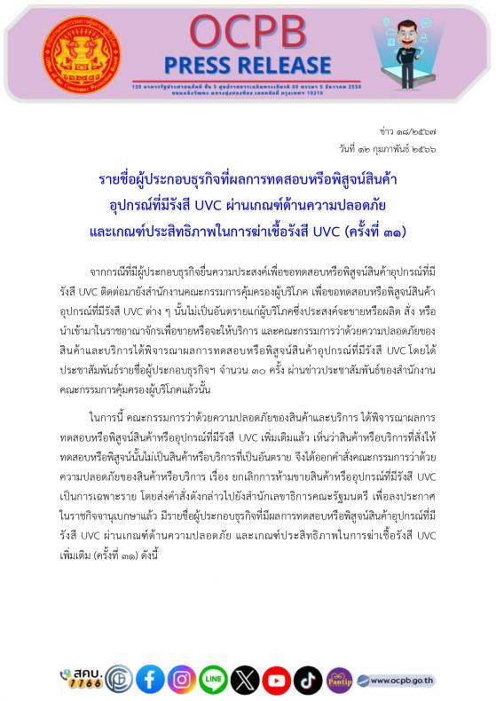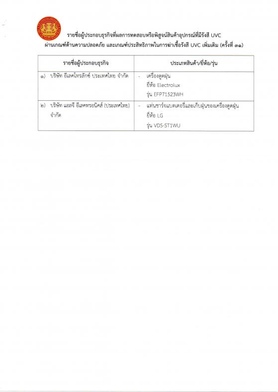 ประกาศรายชื่อผู้ประกอบธุรกิจที่ผลการทดสอบหรือพิสูจน์สินค้าอุปกรณ์ที่มีรังสี UVC ผ่านเกณฑ์ด้านความปลอดภัยและเกณฑ์ประสิทธิภาพในการฆ่าเชื้อรังสี UVC (ครั้งที่ 31)