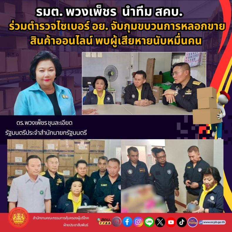 รมต. พวงเพ็ชร นำทีม สคบ. ร่วมตำรวจไซเบอร์ อย. จับกุมขบวนการหลอกขายสินค้าออนไลน์ พบผู้เสียหายนับหมื่นคน