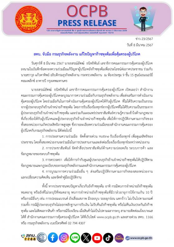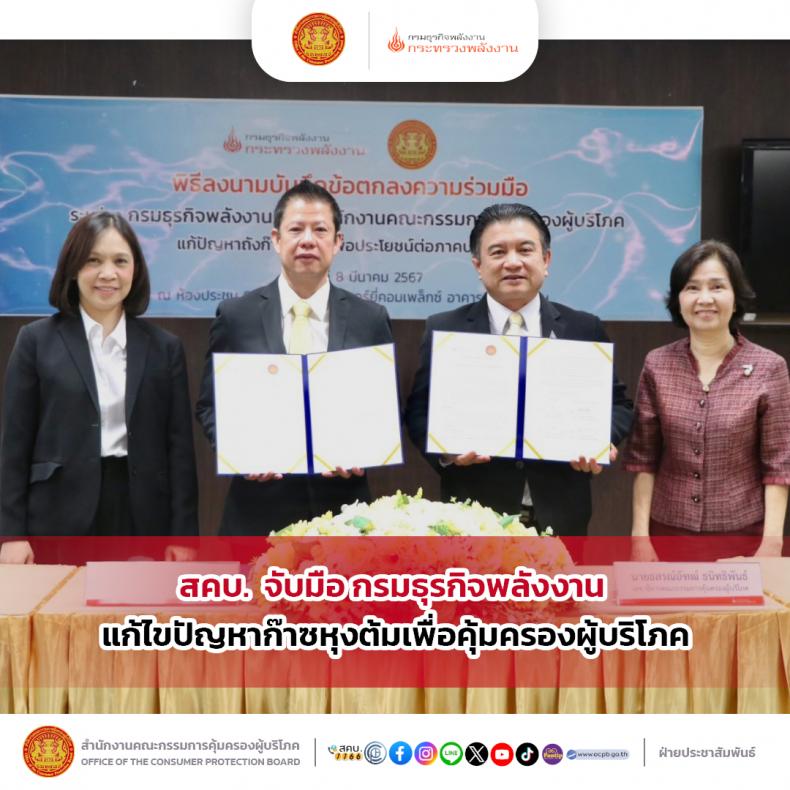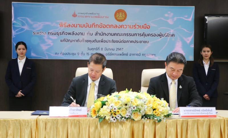 วันศุกร์ที่ 8 มีนาคม 2567 นายธสรณ์อัฑฒ์  ธนิทธิพันธ์ เลขาธิการคณะกรรมการคุ้มครองผู้บริโภค  ลงนามในบันทึกข้อตกลงความร่วมมือแก้ปัญหาผู้บริโภคถังก๊าซหุงต้มเพื่อประโยชน์ต่อภาคประชาชน ร่วมกับนายสราวุธ แก้วตาทิพย์ อธิบดีกรมธุรกิจพลังงาน กระทรวงพลังงาน  ณ ห้องประชุม 9 ชั้น 15 ศูนย์เอนเนอร์ยี่ คอมเพล็กซ์ อาคารบี กรุงเทพมหานคร