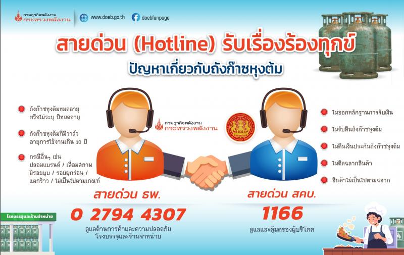 ทั้งนี้ หากประชาชนพบปัญหาเกี่ยวกับถังก๊าซหุงต้ม อาทิ กรณีพบการจำหน่ายถังก๊าซหุงต้มหมดอายุ หรือถังที่ไม่ระบุปีที่หมดอายุ พบการจำหน่ายถังก๊าซหุงต้มที่มีวาล์วอายุการใช้งานเกิน 10 ปี