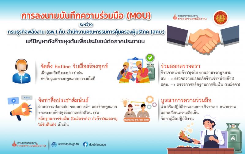 ทั้งสองหน่วยงานเกิดประสิทธิภาพสูงสุด ซึ่งรายละเอียดความร่วมมือของสำนักงานคณะกรรมการคุ้มครองผู้บริโภคกับกรมธุรกิจพลังงาน มีดังต่อไปนี้