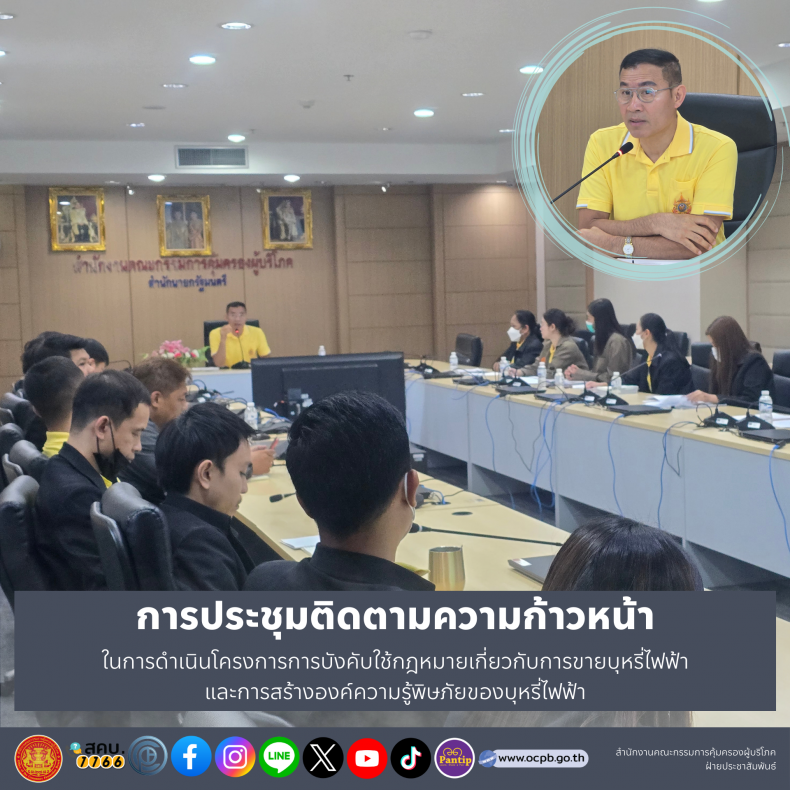 วันที่ 11 มีนาคม 2567 เวลา 13.30 น. รองเลขาธิการคณะกรรมการคุ้มครองผู้บริโภค (พันตำรวจเอกประทีป เจริญกัลป์) ปฏิบัติหน้าที่ผู้อำนวยการศูนย์ปฏิบัติการพิเศษ สคบ. เป็นประธานการประชุมติดตามความก้าวหน้าในการดำเนินโครงการการบังคับใช้กฎหมายเกี่ยวกับการขายบุหรี่ไฟฟ้าและการสร้างองค์ความรู้พิษภัยของบุหรี่ไฟฟ้า (ประจำเดือนมกราคม - กุมภาพันธ์ 2567) โดยในที่ประชุมมีการรายงานผลการดำเนินงานกิจกรรม/การลงพื้นที่ ผลการเบิกจ่ายงบประมาณ และความก้าวหน้าของการดำเนินโครงการ ตลอดจนการพิจารณาถึงปัญหา อุปสรรคในการปฏิบัติงาน เพื่อนำมาปรับปรุงวิธีการดำเนินงานให้มีประสิทธิภาพยิ่งขึ้น ณ ห้องประชุม 1 สคบ.