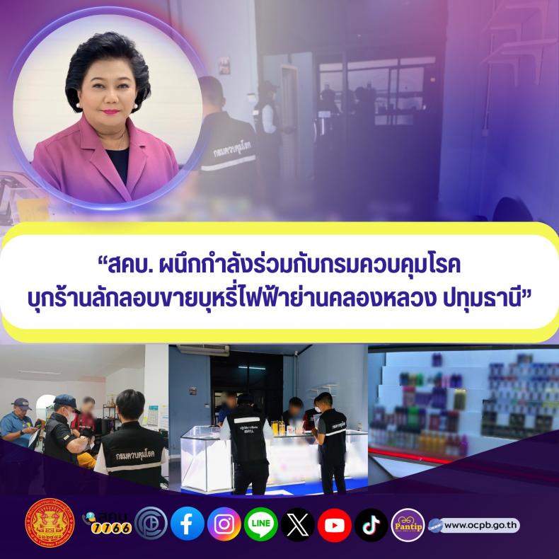 สคบ. ผนึกกำลังร่วมกับกรมควบคุมโรค บุกร้านลักลอบขายบุหรี่ไฟฟ้าย่านคลองหลวง ปทุมธานี