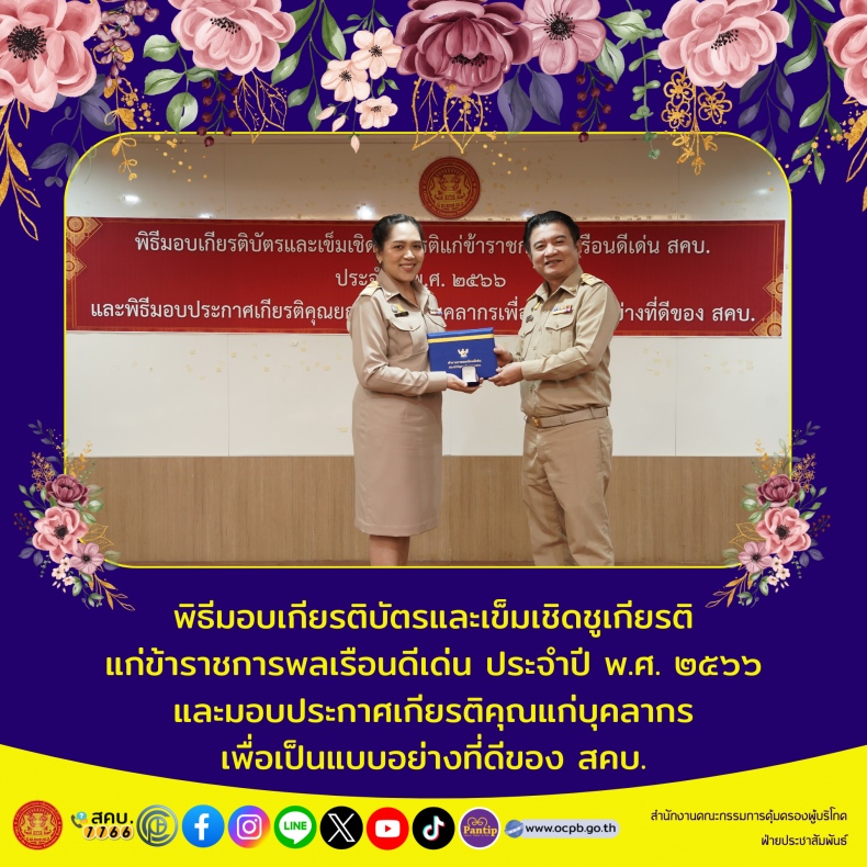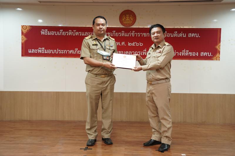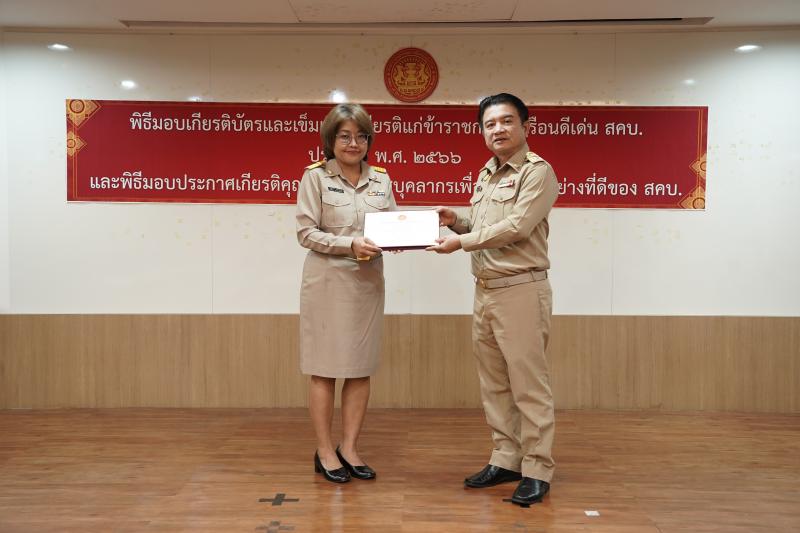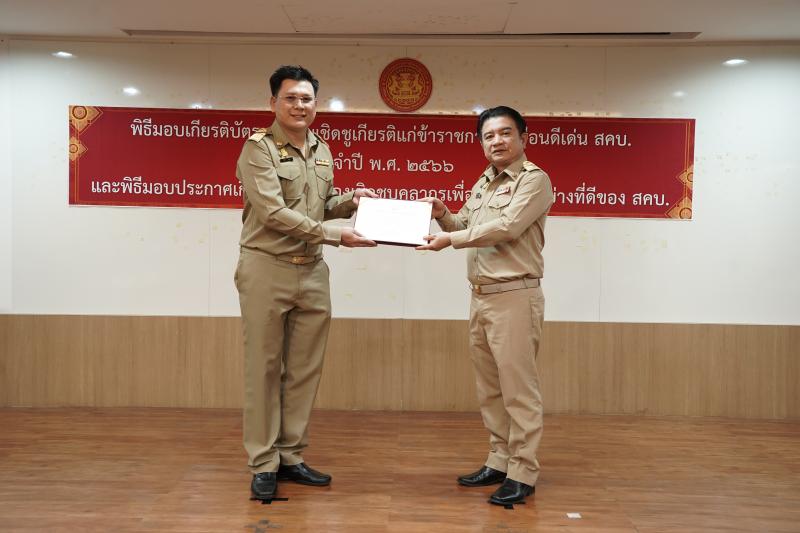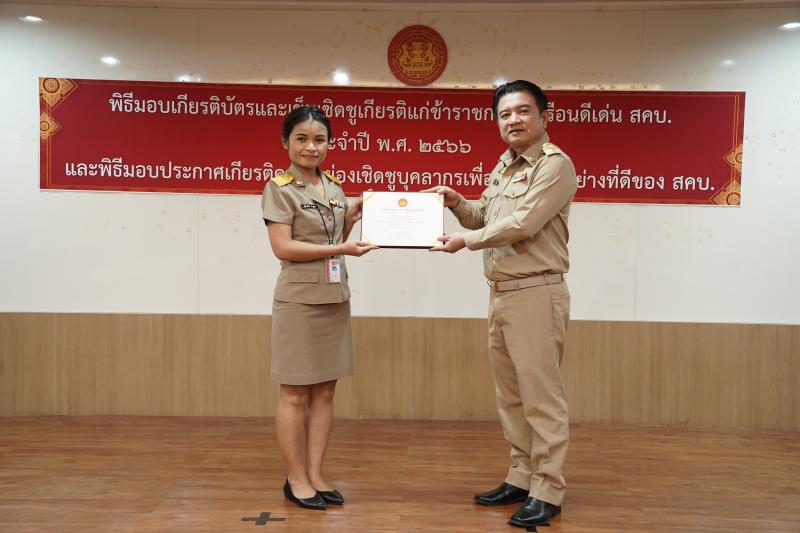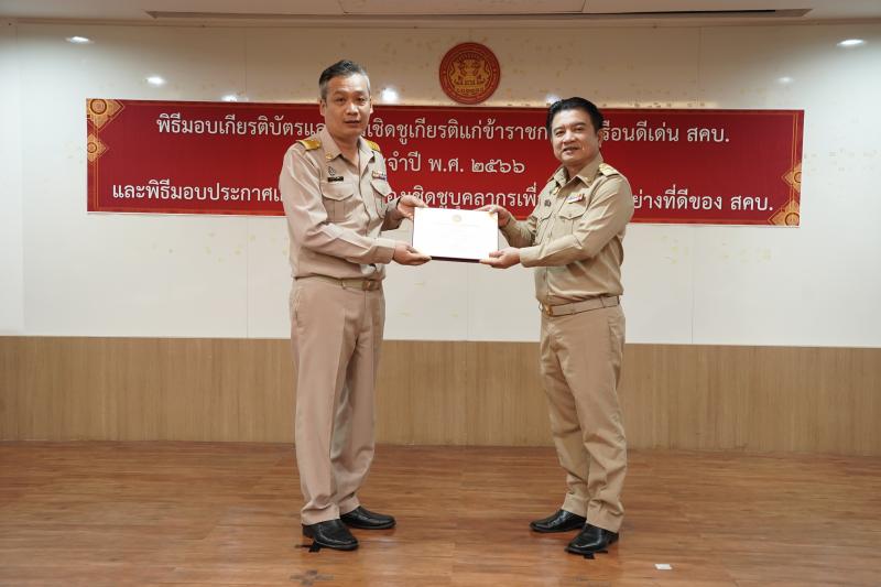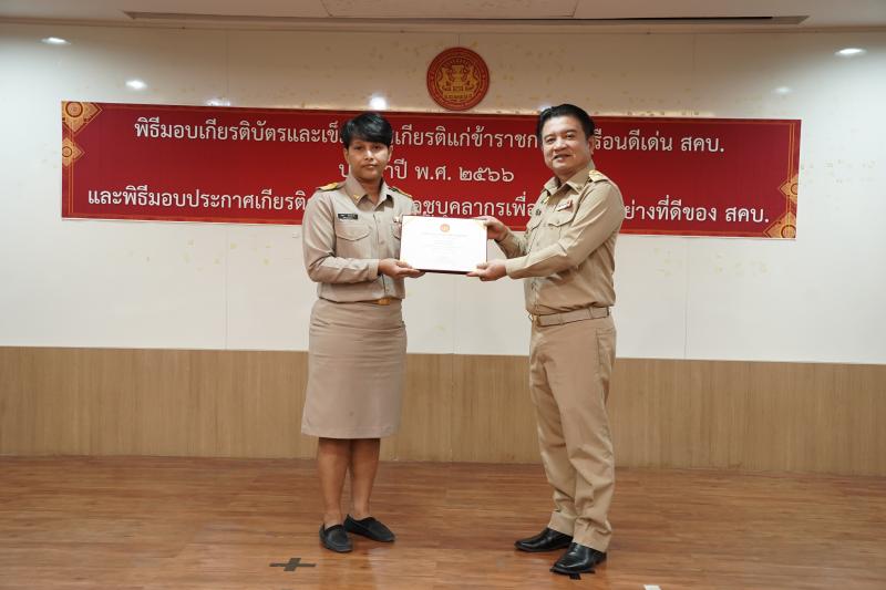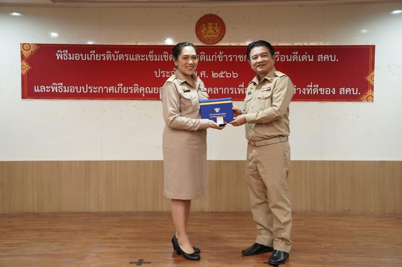พิธีมอบเกียรติบัตรและเข็มเชิดชูเกียรติแก่ข้าราชการพลเรือนดีเด่น ประจำปี พ.ศ. ๒๕๖๖ และมอบประกาศเกียรติคุณแก่บุคลากร เพื่อเป็นแบบอย่างที่ดีของ สคบ.