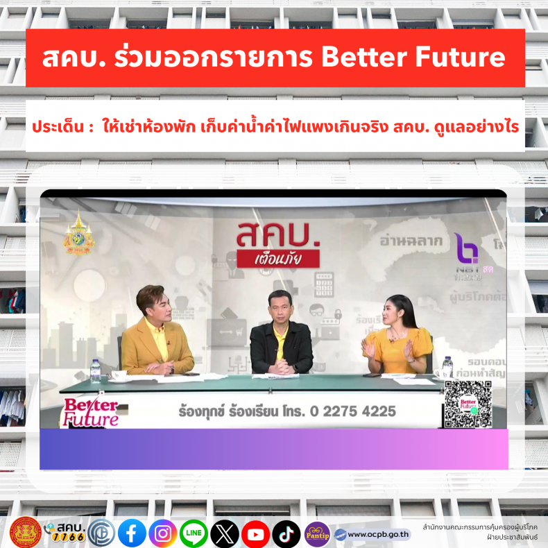 สคบ. ร่วมรายการ “Better Future ” ทางโทรศัพท์ ประเด็น : ให้เช่าห้องพัก เก็บค่าน้ำค่าไฟแพงเกินจริง สคบ. ดูแลอย่างไร