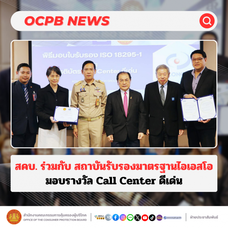 วันอังคารที่ 25 มิถุนายน 2567 เวลา 11.30 น. เลขาธิการคณะกรรมการคุ้มครองผู้บริโภค (นายธสรณ์อัฑฒ์ ธนิทธิพันธ์) มอบหมายให้ ดร.ศรัณย์ รักษ์เผ่า ผู้อำนวยการสำนักแผนและการพัฒนาการคุ้มครองผู้บริโภค เป็นผู้แทนของ สคบ. และนายจงรักษ์  โรจน์พลาเสถียร ผู้อำนวยการสถาบันรับรองมาตรฐานไอเอสโอ พร้อมด้วยผู้บริหารและเจ้าหน้าที่ของทั้งสองหน่วยงานเข้าร่วมเป็นเกียรติแสดงความยินดีและมอบเกียรติบัตรศูนย์รับเรื่องและแก้ไขปัญหาให้กับผู้บริโภค (Call Center) ระดับดีเด่น ให้กับบริษัท กลุ่มแอดวานซ์ รีเสิร์ช จำกัด (Aconnect) ณ อาคารเอ็มเอส สยาม ชั้น 31 ห้อง ASIC ถนนพระรามที่ 3 แขวงช่องนนทรี เขตยานาวา กรุงเทพฯ โดยดำเนินการภายใต้กรอบความร่วมมือในการบูรณาการการตรวจประเมินและรับรองตามมาตรฐาน ISO 18295-1: 2017 กับการประเมินตามหลักเกณฑ์การคัดเลือกศูนย์รับเรื่องและแก้ไขปัญหาให้กับผู้บริโภค (Call Center) ระดับดีเด่น ของ สคบ. ระหว่างสำนักงานคณะกรรมการคุ้มครองผู้บริโภคกับสถาบันรับรองมาตรฐานไอเอสโอ