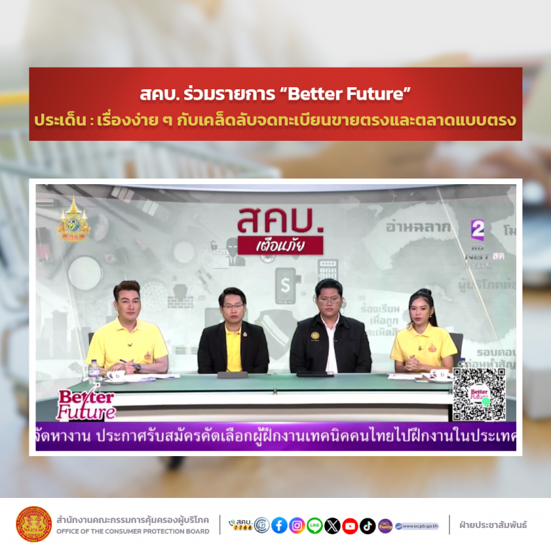สคบ. ร่วมรายการ Better Future ประเด็น : เรื่องง่าย ๆ กับเคล็ดลับจดทะเบียนขายตรงและตลาดแบบตรง