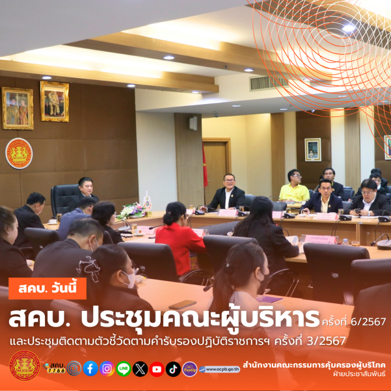 วันพฤหัสบดีที่ 1 สิงหาคม พ.ศ. 2567 เวลา 08.30-12.00 น. เลขาธิการคณะกรรมการคุ้มครองผู้บริโภค (นายธสรณ์อัฑฒ์ ธนิทธิพันธ์)  เป็นประธานการประชุมคณะผู้บริหาร สคบ. ครั้งที่ 6/2567 เพื่อติดตามผลดำเนินงานของสำนัก/กอง  แนวทางการแก้ไขปัญหาและพัฒนางานเพื่อสร้างความเชื่อมั่นให้กับผู้บริโภค และการประชุมคณะทำงานติดตามตัวชี้วัดตามคำรับรองปฏิบัติราชการฯ ครั้งที่ 3/2567 เพื่อติดตามผลการดำเนินงานตัวชี้วัดตามมาตรการปรับปรุงประสิทธิภาพในการปฏิบัติราชการฯ (รอบ 12 เดือน)  ณ ห้องประชุม 5 สำนักงานคณะกรรมการคุ้มครองผู้บริโภค