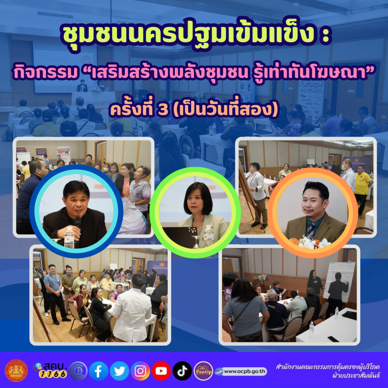 วันเสาร์ที่ 7 กันยายน 2567 เวลา 09.00 น. สำนักงานคณะกรรมการคุ้มครองผู้บริโภคจัดกิจกรรม "เสริมสร้างพลังชุมชน รู้เท่าทันโฆษณา” ครั้งที่ 3 ภายใต้โครงการแก้ไขปัญหาด้านการคุ้มครองผู้บริโภคเชิงบูรณาการ เป็นวันที่สอง โดยกิจกรรมดังกล่าวมีวัตถุประสงค์เพื่อเสริมสร้างความรู้ความเข้าใจเกี่ยวกับการคุ้มครองผู้บริโภคด้านโฆษณาในมิติต่าง ๆ แก่ผู้แทนหน่วยงานภาครัฐ กลุ่มผู้นำชุมชน อาสาสมัครสาธารณสุขประจำหมู่บ้าน เครือข่ายศูนย์คุ้มครองสิทธิผู้บริโภคในพื้นที่จังหวัดนครปฐม รวมจำนวนทั้งสิ้น 92 คน จัดขึ้นระหว่างวันที่ 6 - 7 กันยายน 2567 ณ โรงแรมยูนิแลนด์ กอล์ฟ แอนด์ รีสอร์ท จังหวัดนครปฐม กิจกรรมในวันที่สองประกอบด้วยการบรรยายจากทีมวิทยากรของ สคบ. ในหัวข้อ "การคุ้มครองผู้บริโภคด้านโฆษณาของ สคบ.” และการแบ่งกลุ่มระดมสมอง "พลังชุมชน รู้เท่าทันโฆษณา” พร้อมนำเสนอและสรุปผลร่วมกัน