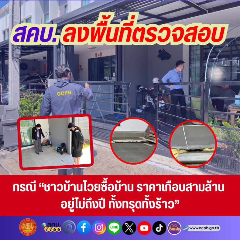 สคบ. ลงพื้นที่ตรวจสอบ กรณี “ชาวบ้านโวยซื้อบ้านราคาเกือบสามล้าน อยู่ไม่ถึงปี ทั้งทรุดทั้งร้าว”