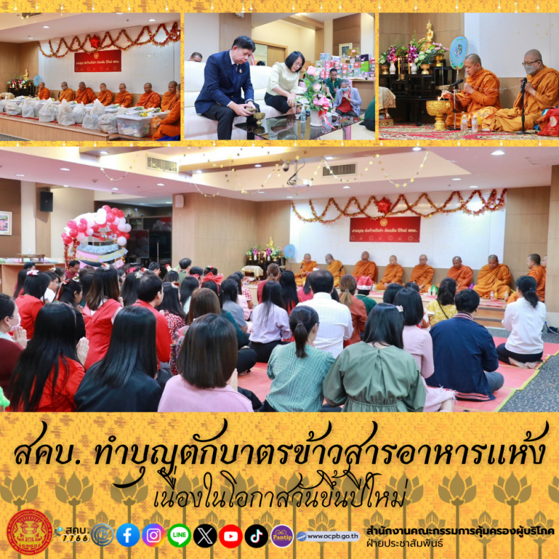วันอังคารที่ 24 ธันวาคม พ.ศ. 2567 เวลา 9.00 น.  นางสาวทรงศิริ จุมพล รองเลขาธิการคณะกรรมการคุ้มครองผู้บริโภค รักษาราชการแทน เลขาธิการคณะกรรมการคุ้มครองผู้บริโภค เป็นประธานในพิธีทำบุญตักบาตรข้าวสารอาหารแห้ง พร้อมด้วยว่าที่เลขาธิการคณะกรรมการคุ้มครองผู้บริโภค นายรณรงค์ พูลพิพัฒน์ และคณะผู้บริหารและเจ้าหน้าที่ สคบ. เนื่องในโอกาสวันขึ้นปีใหม่ 2568 ณ ห้องประชุม 5 สำนักงานคณะกรรมการคุ้มครองผู้บริโภค