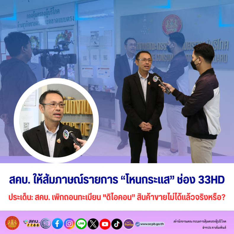 สคบ. ให้สัมภาษณ์รายการ “โหนกระแส” ช่อง 33HD ประเด็น: สคบ. เพิกถอนทะเบียน "ดิไอคอน” สินค้าขายไม่ได้แล้วจริงหรือ?