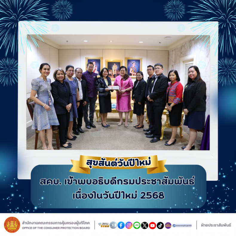 วันศุกร์ที่ 10 มกราคม พ.ศ. 2568 เวลา 13.00 น. นางสาวทรงศิริ จุมพล รองเลขาธิการคณะกรรมการคุ้มครองผู้บริโภค รักษาราชการแทนเลขาธิการคณะกรรมการคุ้มครองผู้บริโภค เข้าพบอธิบดีกรมประชาสัมพันธ์ (นางสุดฤทัย เลิศเกษม) เนื่องในโอกาสวันขึ้นปีใหม่ 2568 ทั้งนี้ อธิบดีกรมประชาสัมพันธ์ ได้กล่าวขอบคุณรองเลขาธิการฯ คณะผู้บริหาร พร้อมด้วยเจ้าหน้าที่ สคบ. ที่ได้ปฏิบัติงานด้วยความตั้งใจพร้อมกับความสื่อสัตย์สุจริตมาตลอดทั้งปี และยังอวยพรขอให้ทุกท่านจงมีความสุขในปีใหม่ พ.ศ. 2568