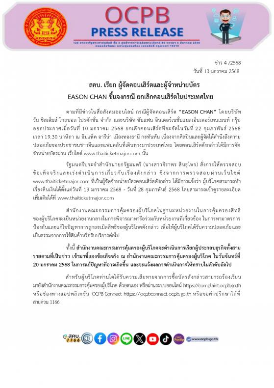 สคบ. เรียก ผู้จัดคอนเสิร์ตและผู้จำหน่ายบัตร EASON CHAN ชี้แจงกรณี ยกเลิกคอนเสิร์ตในประเทศไทย