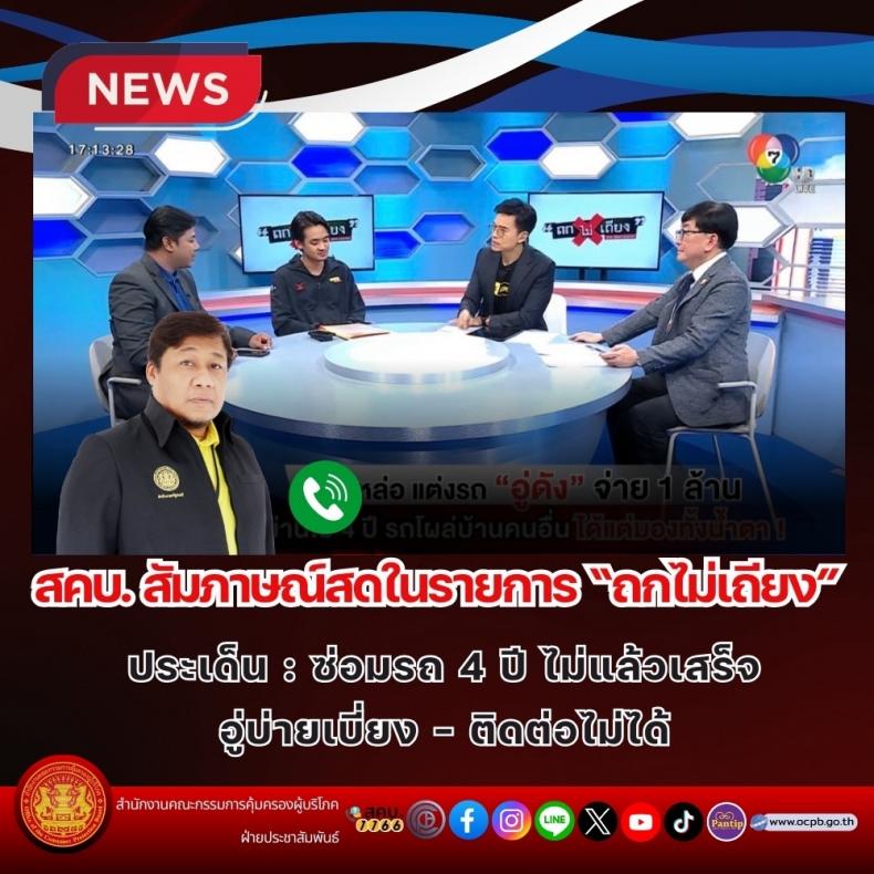 สคบ. สัมภาษณ์สดในรายการ “ถกไม่เถียง” ประเด็น : ซ่อมรถ 4 ปี ไม่แล้วเสร็จ อู่บ่ายเบี่ยง - ติดต่อไม่ได้