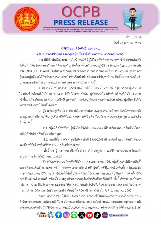 OPPO และ REAlME แจง สคบ. เตรียมประกาศเยียวยาผู้บริโภคที่ได้รับผลกระทบครอบคลุมทุกกลุ่ม