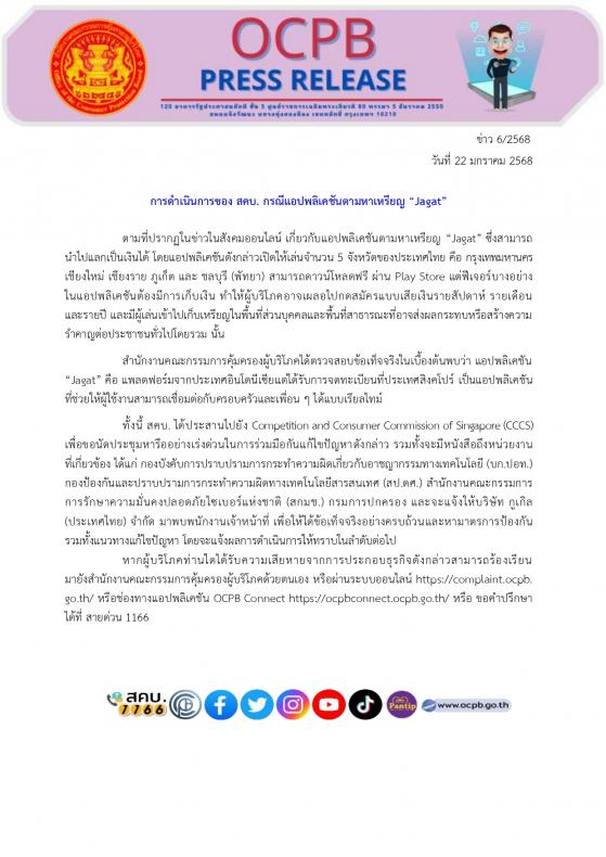 การดำเนินการของ สคบ. กรณีแอปพลิเคชันตามหาเหรียญ “Jagat”