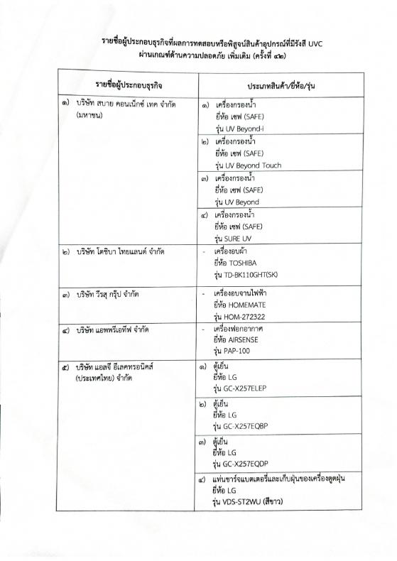 ประกาศรายชื่อผู้ประกอบธุรกิจที่ผลการทดสอบหรือพิสูจน์สินค้าอุปกรณ์ที่มีรังสี UVC ผ่านเกณฑ์ด้านความปลอดภัยและเกณฑ์ประสิทธิภาพในการฆ่าเชื้อรังสี UVC (ครั้งที่ 42)