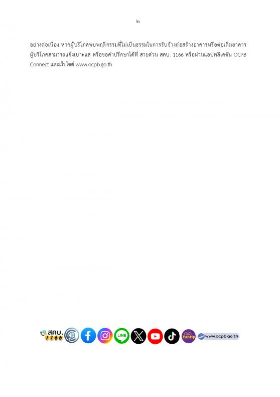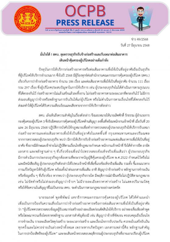 ว่า “ผู้บริโภคควรตรวจสอบข้อมูลผู้รับเหมาก่อสร้างอย่างละเอียดก่อนตัดสินใจใช้บริการ อย่าหลงเชื่อเพียงคำพูด หรือโฆษณาชวนเชื่อโดยขาดหลักฐาน เอกสารสำคัญต้องมี เช่น สัญญาว่าจ้างที่ชัดเจน ครอบคลุมถึงเงื่อนไข การชำระเงิน รายละเอียดวัสดุก่อสร้าง ระยะเวลาก่อสร้าง และเงื่อนไขการรับประกัน ควรขอใบเสร็จรับเงินทุกครั้งและไม่ควรจ่ายเงินล่วงหน้าทั้งหมด เพราะหากเกิดปัญหา เอกสารเหล่านี้คือ หลักฐานสำคัญในการปกป้องสิทธิของผู้บริโภค” และจะเดินหน้าตรวจสอบพฤติกรรมผู้ประกอบธุรกิจที่อาจเอาเปรียบผู้บริโภคอย่างต่อเนื่อง หากผู้บริโภคพบพฤติกรรมที่ไม่เป็นธรรมในการรับจ้างก่อสร้างอาคารหรือต่อเติมอาคาร ผู้บริโภคสามารถแจ้งเบาะแส หรือขอคำปรึกษาได้ที่ สายด่วน สคบ. 1166 หรือผ่านแอปพลิเคชัน OCPB Connect และเว็บไซต์ www.ocpb.go.th