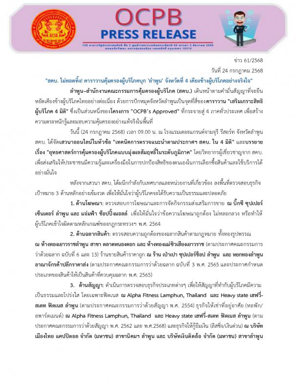 3. ด้านสัญญา: ดำเนินการตรวจสอบธุรกิจประเภทต่างๆ เพื่อให้สัญญาที่ทำกับผู้บริโภคมีความเป็นธรรมและโปร่งใส โดยเฉพาะฟิตเนส ณ Alpha Fitness Lamphun, Thailand  และ Heavy state เฮฟวี่-สเตท ฟิตเนส ลำพูน (ตามประกาศคณะกรรมการว่าด้วยสัญญา พ.ศ. 2554) ธุรกิจให้เช่าที่อยู่อาศัย (หอพัก/อพาร์ตเมนต์) ณ Alpha Fitness Lamphun, Thailand  และ Heavy state เฮฟวี่-สเตท ฟิตเนส ลำพูน (ตามประกาศคณะกรรมการว่าด้วยสัญญา พ.ศ. 2562 และ พ.ศ.2568) และธุรกิจให้กู้ยืมเงิน (ลิสซิ่ง/เงินด่วน) ณ บริษัทเมืองไทย แคปปิตอล จำกัด (มหาชน) สาขานิคมฯ ลำพูน และ บริษัทเงินติดล้อ จำกัด (มหาชน) สาขาลำพูน (ตามประกาศคณะกรรมการว่าด้วยสัญญา พ.ศ. 2565) ผู้ประกอบการในพื้นที่ต่างให้ความร่วมมือเป็นอย่างดีกับการลงพื้นที่ครั้งนี้ นอกจากนี้ ยังมีการเดินรณรงค์สร้างความตระหนักรู้เรื่องสิทธิผู้บริโภค ณ บิ๊กซี ซุปเปอร์เซ็นเตอร์ ลำพูน ซึ่งได้รับความสนใจจากทั้งผู้ประกอบธุรกิจและประชาชนจำนวนมาก สคบ. ยืนยันความพร้อมที่จะเป็นเกราะคุ้มครองผู้บริโภคให้ได้รับความยุติธรรมอย่างเต็มที่ในทุกมิติ