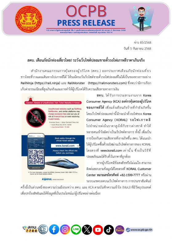 สคบ. ได้รับการประสานงานจาก Korea Consumer Agency (KCA) องค์กรคุ้มครองผู้บริโภคของเกาหลีใต้ เพื่อแจ้งเตือนภัยร้ายที่กำลังเกิดขึ้น โดยเว็บไซต์ปลอมเหล่านี้มักจะนำตั๋วรถไฟของ Korea Consumer Agency (KORAIL) รถไฟเกาหลี ไปจำหน่ายต่อในราคาสูงให้กับชาวต่างชาติ ทำให้หลายคนเข้าใจผิดว่าเป็นเว็บไซต์ทางการ ทั้งนี้ เพื่อเป็นการป้องกันความเสียหายที่อาจเกิดขึ้น สคบ. ได้แนะนำให้ผู้บริโภคซื้อตั๋วรถไฟผ่านเว็บไซต์ทางการของ KORAIL โดยตรงที่ www.korail.com เท่านั้น ซึ่งเป็นวิธีที่ปลอดภัยและได้รับตั๋วในราคาที่ถูกต้อง