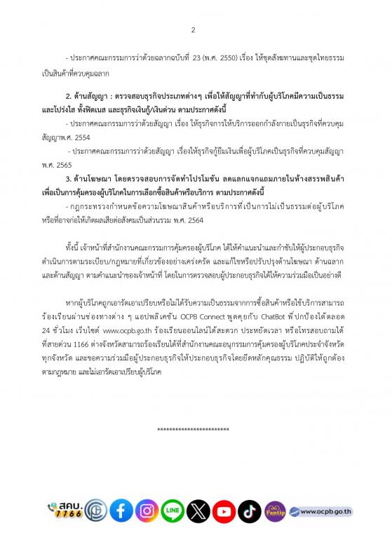 2. ด้านสัญญา : ตรวจสอบธุรกิจประเภทต่างๆ เพื่อให้สัญญาที่ทำกับผู้บริโภคมีความเป็นธรรม