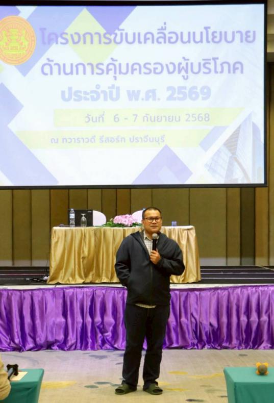 เมื่อวันเสาร์ที่ 6 กันยายน 2568 เวลา 10.30 น. นายรณรงค์ พูลพิพัฒน์ เลขาธิการคณะกรรมการคุ้มครองผู้บริโภค เป็นประธานเปิดโครงการขับเคลื่อนนโยบายด้านการคุ้มครองผู้บริโภค ประจำปี พ.ศ.2569 พร้อมบรรยายพิเศษ “นโยบายและทิศทางการขับเคลื่อนงานด้านการคุ้มครองผู้บริโภค” การอภิปราย “ขับเคลื่อนนโยบายเชิงบูรณาการด้านการคุ้มครองผู้บริโภค” โดยนางสาวทรงศิริ จุมพล รองเลขาธิการคณะกรรมการคุ้มครองผู้บริโภค และนายฐิตินันท์ สิงหา รองเลขาธิการคณะกรรมการคุ้มครองผู้บริโภค การทำกิจกรรมกลุ่มสัมพันธ์ที่แฝงไปด้วยแนวคิดในการทำงานร่วมกันเป็นทีม การแก้ไขปัญหา ความสามัคคี เพื่อนำไปต่อยอดปรับใช้ในการทำงานได้อย่างมีประสิทธิภาพ อีกทั้งยังมีการแบ่งกลุ่มระดมความคิดเห็นในการ “บูรณาการงานและแนวทางในการดำเนินงานคุ้มครองผู้บริโภค ในปี 2569” ได้แก่ การดำเนินงานคุ้มครองผู้บริโภคด้านโฆษณา การดำเนินงานคุ้มครองผู้บริโภคด้านฉลาก การดำเนินงานคุ้มครองผู้บริโภคด้านสัญญา การดำเนินงานคุ้มครองผู้บริโภคด้านธุรกิจขายตรงและตลาดแบบตรง การดำเนินการด้านการประสานงานเครือข่าย รวมถึงส่วนภูมิภาคและท้องถิ่น การดำเนินการด้านกฎหมายคุ้มครองผู้บริโภค การดำเนินการขับเคลื่อนแผนยุทธศาสตร์การคุ้มครองผู้บริโภค และการดำเนินการด้านการบริหารจัดการองค์กร โครงการนี้จัดขึ้นระหว่างวันที่ 6 – 7 กันยายน 2568 ณ โรงแรมทวาราวดี รีสอร์ท จังหวัดปราจีนบุรี