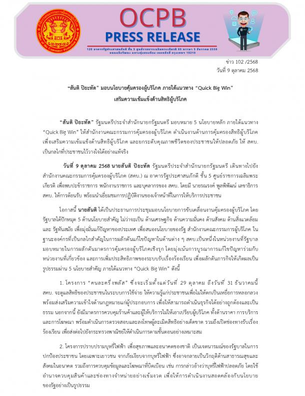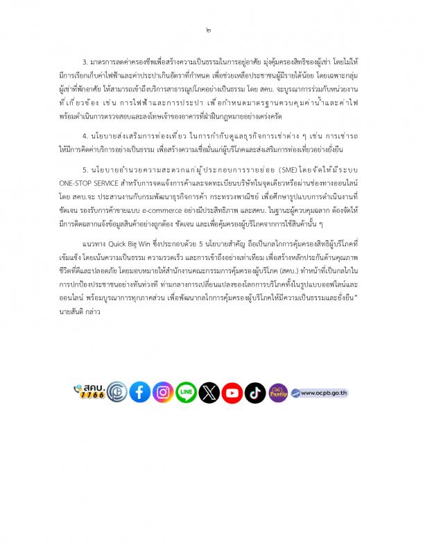 “สันติ ปิยะทัต” รัฐมนตรีประจำสำนักนายกรัฐมนตรี มอบหมาย 5 นโยบายหลัก ภายใต้แนวทาง “Quick Big Win” ให้สำนักงานคณะกรรมการคุ้มครองผู้บริโภค ดำเนินงานด้านการคุ้มครองสิทธิผู้บริโภค  เพื่อเสริมความเข้มแข็งด้านสิทธิผู้บริโภค และยกระดับคุณภาพชีวิตของประชาชนให้ปลอดภัย ให้ สคบ.