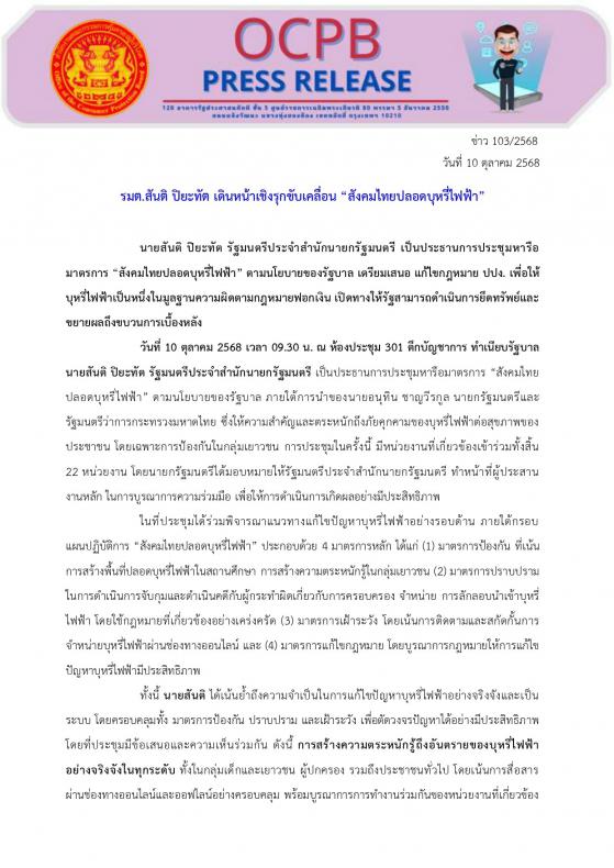 วันที่ 10 ตุลาคม 2568 เวลา 09.30 น. ณ ห้องประชุม 301 ตึกบัญชาการ ทำเนียบรัฐบาล