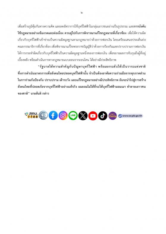 นายสันติ ปิยะทัต รัฐมนตรีประจำสำนักนายกรัฐมนตรี เป็นประธานการประชุมหารือมาตรการ “สังคมไทยปลอดบุหรี่ไฟฟ้า” ตามนโยบายของรัฐบาล เตรียมเสนอ แก้ไขกฎหมาย ปปง. เพื่อให้บุหรี่ไฟฟ้าเป็นหนึ่งในมูลฐานความผิดตามกฎหมายฟอกเงิน เปิดทางให้รัฐสามารถดำเนินการยึดทรัพย์และขยายผลถึงขบวนการเบื้องหลัง