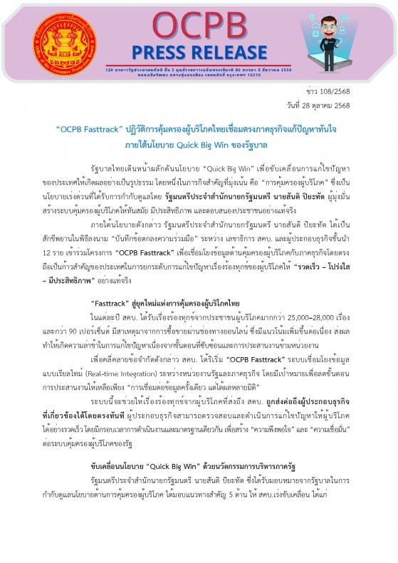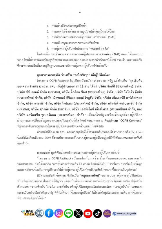 “OCPB Fasttrack” ปฏิวัติการคุ้มครองผู้บริโภคไทยเชื่อมตรงภาคธุรกิจแก้ปัญหาทันใจ ภายใต้นโยบาย Quick Big Win ของรัฐบาล