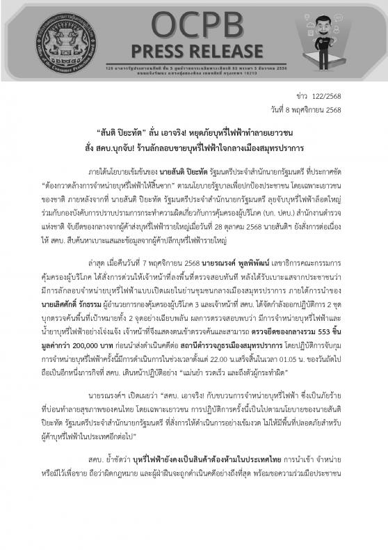 ล่าสุด เมื่อคืนวันที่ 7 พฤศจิกายน 2568 นายรณรงค์ พูลพิพัฒน์ เลขาธิการคณะกรรมการคุ้มครองผู้บริโภค ได้สั่งการด่วนให้เจ้าหน้าที่ลงพื้นที่ตรวจสอบทันที หลังได้รับเบาะแสจากประชาชนว่ามีการลักลอบจำหน่ายบุหรี่ไฟฟ้าแบบเปิดเผยในย่านชุมชนกลางเมืองสมุทรปราการ ภายใต้การนำของ นายเลิศศักดิ์ รักธรรม ผู้อำนวยการกองคุ้มครองผู้บริโภค 3 และเจ้าหน้าที่ สคบ. ได้จัดกำลังออกปฏิบัติการ 2 ชุด บุกตรวจค้นพื้นที่เป้าหมายทั้ง 2 จุดอย่างเฉียบพลัน ผลการตรวจสอบพบว่า มีการจำหน่ายบุหรี่ไฟฟ้าและน้ำยาบุหรี่ไฟฟ้าอย่างโจ่งแจ้ง เจ้าหน้าที่จึงแสดงตนเข้าตรวจค้นและสามารถ ตรวจยึดของกลางรวม 553 ชิ้น มูลค่ากว่า 200,000 บาท ก่อนนำส่งดำเนินคดีต่อ สถานีตำรวจภูธรเมืองสมุทรปราการ โดยปฏิบัติการจับกุมการจำหน่ายบุหรี่ไฟฟ้าครั้งนี้มีการดำเนินการในช่วงเวลาตั้งแต่ 22.00 น.เสร็จสิ้นในเวลา 01.05 น. ของวันถัดไป ถือเป็นอีกหนึ่งภารกิจที่ สคบ. เดินหน้าปฏิบัติอย่าง “แม่นยำ รวดเร็ว และถึงตัวผู้กระทำผิด”
