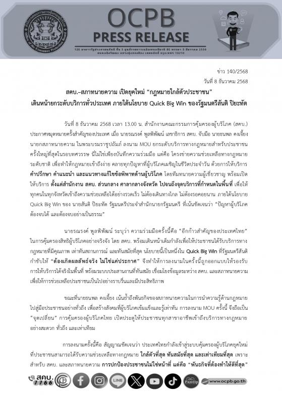 วันที่ 8 ธันวาคม 2568 เวลา 13.00 น. สำนักงานคณะกรรมการคุ้มครองผู้บริโภค (สคบ.) ประกาศหมุดหมายครั้งสำคัญของประเทศ เมื่อ นายรณรงค์ พูลพิพัฒน์ เลขาธิการ สคบ. จับมือ นายธนพล คงเจี้ยง นายกสภาทนายความ ในพระบรมราชูปถัมภ์ ลงนาม MOU ยกระดับบริการทางกฎหมายสำหรับประชาชน ครั้งใหญ่ที่สุดในรอบทศวรรษ นี่ไม่ใช่เพียงบันทึกความร่วมมือ แต่คือ โครงข่ายความช่วยเหลือทางกฎหมายระดับชาติ เพื่อทำให้กฎหมายเข้าถึงง่าย คลายทุกปัญหาที่ผู้บริโภคเผชิญในชีวิตประจำวัน ด้วยการให้บริการ คำปรึกษา คำแนะนำ และแนวทางแก้ไขข้อพิพาทด้านผู้บริโภค โดยทีมทนายความผู้เชี่ยวชาญ พร้อมเปิดให้บริการ ตั้งแต่สำนักงาน สคบ. ส่วนกลาง ศาลากลางจังหวัด ไปจนถึงจุดบริการที่กำหนดในพื้นที่ เพื่อให้ทุกคนในทุกจังหวัดเข้าถึงความช่วยเหลือได้อย่างรวดเร็ว ไม่ต้องเดินทางไกล ไม่ต้องรอคอยนาน ภายใต้นโยบาย Quick Big Win ของ นายสันติ ปิยะทัต รัฐมนตรีประจำสำนักนายกรัฐมนตรี ที่เน้นชัดเจนว่า “ปัญหาผู้บริโภคต้องจบได้ และต้องจบอย่างเป็นธรรม” นายรณรงค์ พูลพิพัฒน์ ระบุว่า ความร่วมมือครั้งนี้คือ “อีกก้าวสำคัญของประเทศไทย” ในการคุ้มครองสิทธิผู้บริโภคอย่างจริงจัง โดย สคบ. พร้อมเดินหน้าเต็มกำลังเพื่อให้ประชาชนได้รับบริการทางกฎหมายที่มีคุณภาพ เท่าทันสถานการณ์ และทันสมัยที่สุด นโยบายนี้เป็นหนึ่งใน Quick Big Win ที่รัฐมนตรีสันติกำชับให้ “ต้องเกิดผลลัพธ์จริง ไม่ใช่แค่ประกาศ” จึงทำให้การลงนามในครั้งนี้ถูกออกแบบให้รองรับการให้บริการได้จริงในพื้นที่ พร้อมระบบประสานงานที่ทันสมัย เชื่อมโยงข้อมูลระหว่าง สคบ. และสภาทนายความเพื่อให้การช่วยเหลือประชาชนเป็นไปอย่างราบรื่นและมีประสิทธิภาพ ขณะที่นายธนพล คงเจี้ยง เน้นย้ำถึงพันธกิจของสภาทนายความในการนำความรู้ด้านกฎหมายไปสู่มือประชาชนอย่างทั่วถึง เพื่อสร้างสังคมที่ผู้บริโภคเข้มแข็งและรู้เท่าทัน การลงนาม MOU ครั้งนี้ จึงถือเป็น “จุดเปลี่ยน” การคุ้มครองผู้บริโภคไทย เปิดประตูให้ประชาชนทุกสาขาอาชีพเข้าถึงบริการทางกฎหมาย อย่างสะดวก ทั่วถึง และเท่าเทียม การลงนามครั้งนี้คือ สัญญาณชัดเจนว่า ประเทศไทยกำลังเข้าสู่ระบบคุ้มครองผู้บริโภคยุคใหม่ ที่ประชาชนสามารถได้รับความช่วยเหลือทางกฎหมาย ใกล้ตัวที่สุด ทันสมัยที่สุด และเท่าเทียมที่สุด เพราะสำหรับ สคบ. และสภาทนายความ การปกป้องประชาชนไม่ใช่หน้าที่ แต่คือ “พันธกิจที่ต้องทำให้ดีที่สุด”