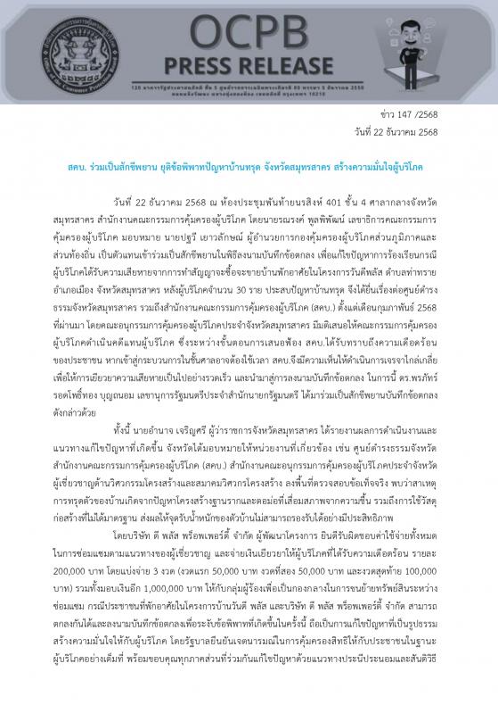 สคบ. ร่วมเป็นสักขีพยาน ยุติข้อพิพาทปัญหาบ้านทรุด จังหวัดสมุทรสาคร สร้างความมั่นใจผู้บริโภค