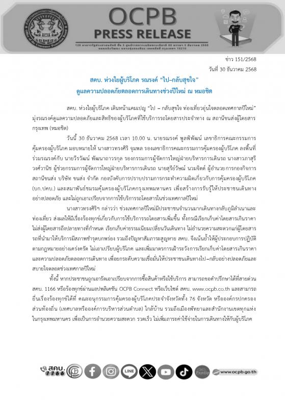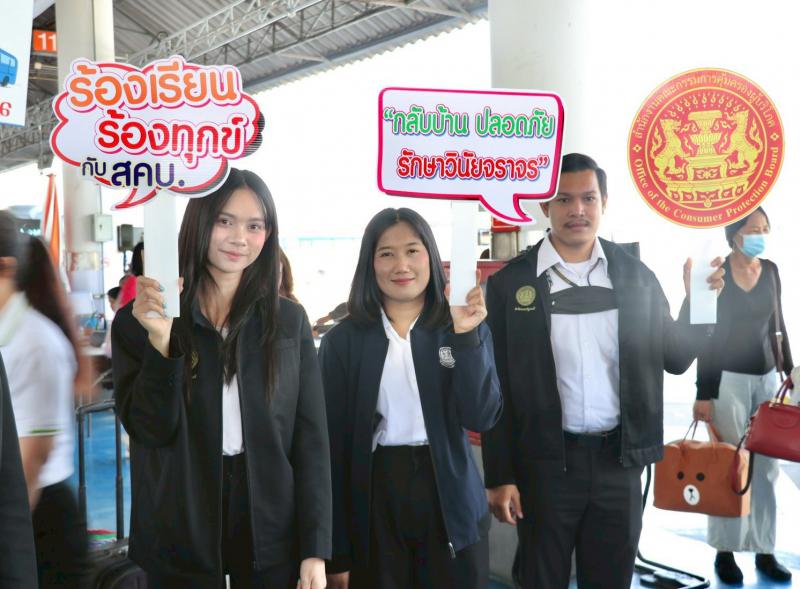 วันนี้ 30 ธันวาคม 2568 เวลา 10.00 น. นายรณรงค์ พูลพิพัฒน์ เลขาธิการคณะกรรมการคุ้มครองผู้บริโภค มอบหมายให้ นางสาวทรงศิริ จุมพล รองเลขาธิการคณะกรรมการคุ้มครองผู้บริโภค ลงพื้นที่ร่วมรณรงค์กับ นายวีรวัฒน์ พัฒนาถาวรกุล รองกรรมการผู้จัดการใหญ่ฝ่ายบริหารการเดินรถ นางสาวภาสุรี วงศ์วานิช ผู้ช่วยกรรมการผู้จัดการใหญ่ฝ่ายบริหารการเดินรถ นายสุรีย์วัษณ์ นวมจิตต์ ผู้อำนวยการกองกิจการสถานีขนส่ง บริษัท ขนส่ง จำกัด กองบังคับการปราบปรามการกระทำความผิดเกี่ยวกับการคุ้มครองผู้บริโภค (บก.ปคบ.) และสมาพันธ์ชมรมคุ้มครองผู้บริโภคกรุงเทพมหานคร เพื่อสร้างการรับรู้ให้ประชาชนเดินทางอย่างปลอดภัย และไม่ถูกเอาเปรียบจากการใช้บริการรถโดยสารในช่วงเทศกาลปีใหม่