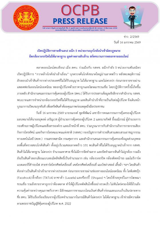 วันที่ 16 มกราคม 2569 นายรณรงค์ พูลพิพัฒน์ เลขาธิการคณะกรรมการคุ้มครองผู้บริโภค มอบหมายให้นายอนุพงษ์ เจริญเวช ผู้อำนวยการคุ้มครองผู้บริโภค 2 และนายกิตติ อึ้งมณีภรณ์ ผู้อำนวยการ