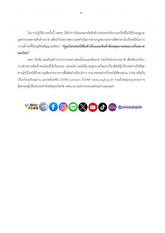 สคบ. ยืนยัน จะเดินหน้าปราบปรามอย่างต่อเนื่องและเข้มงวด ร่วมกับหน่วยงานภาคี เพื่อจัดระเบียบการจำหน่ายสินค้าออนไลน์ให้เป็นธรรม ปลอดภัย และได้มาตรฐาน พร้อมปกป้องสิทธิผู้บริโภคอย่างถึงที่สุด หากผู้บริโภคได้รับความเสียหายจากการซื้อสินค้าหรือบริการ สามารถขอคำปรึกษาได้ที่สายด่วน 1166 หรือยื่นเรื่องร้องเรียนผ่าน แอปพลิเคชัน OCPB Connect เว็บไซต์ www.ocpb.go.th รวมถึงคณะอนุกรรมการคุ้มครองผู้บริโภคประจำจังหวัดทุกจังหวัด เทศบาล องค์กรปกครองส่วนตำบลทุกแห่ง