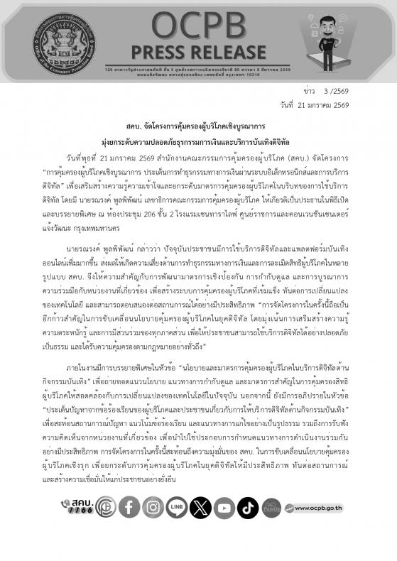 วันที่พุธที่ 21 มกราคม 2569 สำนักงานคณะกรรมการคุ้มครองผู้บริโภค (สคบ.) จัดโครงการ “การคุ้มครองผู้บริโภคเชิงบูรณาการ ประเด็นการทำธุรกรรมทางการเงินผ่านระบบอิเล็กทรอนิกส์และการบริการดิจิทัล” เพื่อเสริมสร้างความรู้ความเข้าใจและยกระดับมาตรการคุ้มครองผู้บริโภคในบริบทของการใช้บริการดิจิทัล โดยมี นายรณรงค์ พูลพิพัฒน์ เลขาธิการคณะกรรมการคุ้มครองผู้บริโภค ให้เกียรติเป็นประธานในพิธีเปิดและบรรยายพิเศษ ณ ห้องประชุม 206 ชั้น 2 โรงแรมเซนทาราไลฟ์ ศูนย์ราชการและคอนเวนชันเซนเตอร์แจ้งวัฒนะ กรุงเทพมหานคร
