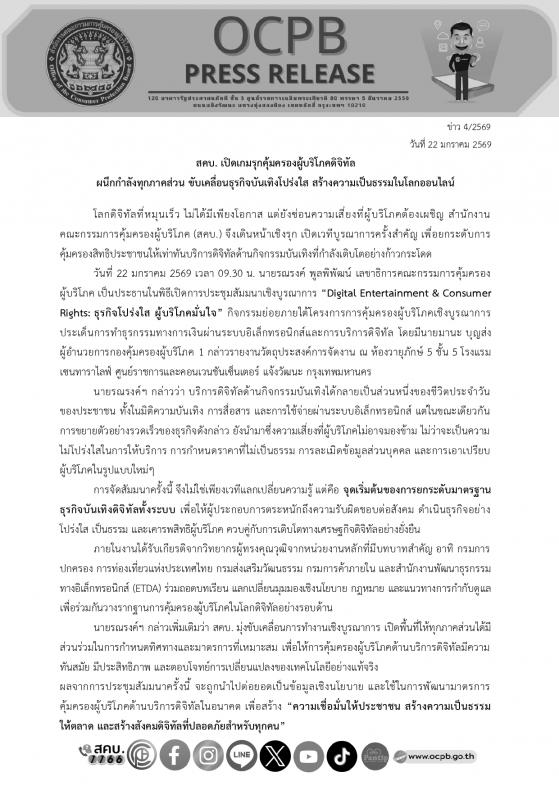 วันพฤหัสบดีที่ 22 มกราคม 2569 เวลา 09.30 น. นายรณรงค์ พูลพิพัฒน์ เลขาธิการคณะกรรมการคุ้มครองผู้บริโภค เป็นประธานในพิธีเปิดการประชุมสัมมนาเชิงบูรณาการ “Digital Entertainment & Consumer Rights: ธุรกิจโปร่งใส ผู้บริโภคมั่นใจ” กิจกรรมย่อยภายใต้โครงการการคุ้มครองผู้บริโภคเชิงบูรณาการ ประเด็นการทำธุรกรรมทางการเงินผ่านระบบอิเล็กทรอนิกส์และการบริการดิจิทัล ณ ห้องวายุภักษ์ 5 ชั้น 5 โรงแรม เซนทาราไลฟ์ ศูนย์ราชการและคอนเวนชันเซ็นเตอร์ แจ้งวัฒนะ กรุงเทพมหานคร