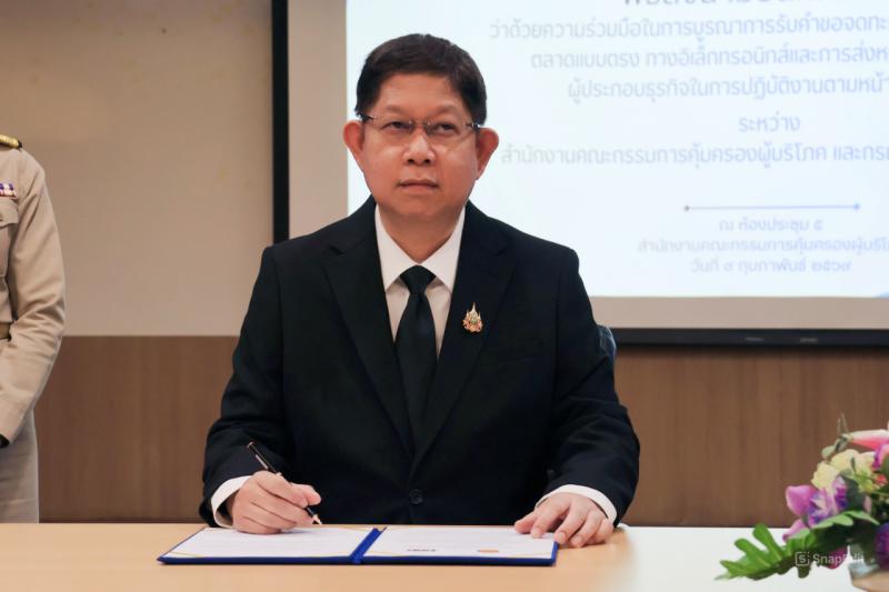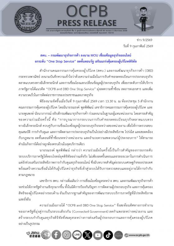 สำนักงานคณะกรรมการคุ้มครองผู้บริโภค (สคบ.) และกรมพัฒนาธุรกิจการค้า (DBD) กระทรวงพาณิชย์ ลงนามบันทึกความเข้าใจว่าด้วยความร่วมมือในการรับคำขอจดทะเบียนการประกอบธุรกิจตลาดแบบตรงทางอิเล็กทรอนิกส์ และการเชื่อมโยงแลกเปลี่ยนข้อมูลผู้ประกอบธุรกิจ เพื่อยกระดับการให้บริการภาครัฐภายใต้แนวคิด “OCPB and DBD One Stop Service” มุ่งลดความซ้ำซ้อน ลดภาระเอกสาร และเพิ่มความรวดเร็วในการติดต่อราชการของประชาชนและภาคธุรกิจ