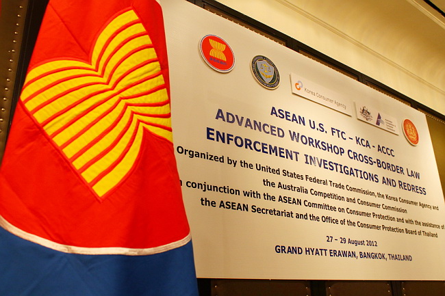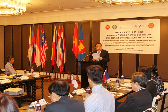 27 สิงหาคม 2555 ศาสตราจารย์พิเศษธงทอง จันทรางศุ ปลัดสานักนายกรัฐมนตรี เป็นประธานเปิด การประชุมเชิงปฏิบัติการของอาเซียนด้านการบังคับใช้กฎหมายและการเยียวยาผู้บริโภค ข้ามแดน (Advance Workshop on Cross-Border Law Enforcement Investigations and Redress) ซึ่งจัดโดยคณะกรรมาธิการการค้าแห่งสหพันธรัฐอเมริกา (U.S.FTC) สานักงานกิจการผู้บริโภคสาธารณรัฐเกาหลี (KCA) และคณะกรรมาธิการว่าด้วยการแข่งขัน และการคุ้มครองผู้บริโภคแห่งประเทศออสเตรเลีย(ACCC) ในการนี้นายจิรชัย มูลทองโร่ย รองเลขาธิการคณะกรรมการคุ้มครองผู้บริโภค และคณะผู้จัดการประชุมให้การต้อนรับ