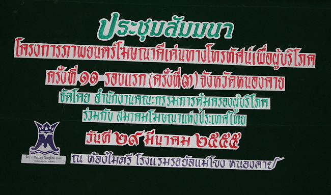29 มี.ค. 2555 สคบ. ร่วมกับ สมาคมโฆษณาแห่งประเทศไทย จัดโครงการภาพยนตร์โฆษณาดีเด่นทางโทรทัศน์เพื่อผู้บริโภค ครั้งที่ 11 รอบแรก ครั้งที่ ๓ โดยมีรองผู้ว่าราชการจังหวัดหนองคาย (นายวิเชียร ปิยะวรากร) เป็นประธานเปิดงาน ณ โรงแรมรอยัล แม่โขงหนองคาย อ.เมือง จ.หนองคาย