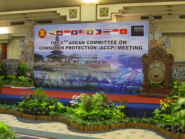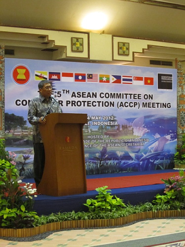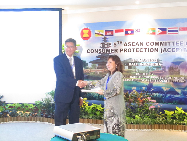 2-4 พฤษภาคม 2555 "นายจิรชัย มูลทองโร่ย รองเลขาธิการสำนักงานคณะกรรมการคุ้มครองผู้บริโภค (สคบ.) และคณะ ได้เดินทางไปราชการเพื่อเข้าร่วมการประชุมคณะกรรมการอาเซียนด้านการคุ้มครองผู้บริโภค ครั้งที่ ๕ (The 5th Meeting of the ASEAN Committee on Consumer Protection: ACCP) ณ กรุงบาหลี สาธารณรัฐอินโดนีเซีย โดยมี H.E.Bayu Krisnamurthi รัฐมนตรีช่วยว่าการกระทรวงการค้าของ ประเทศอินโดนีเซีย เป็นประธานในพิธีเปิดการประชุม”