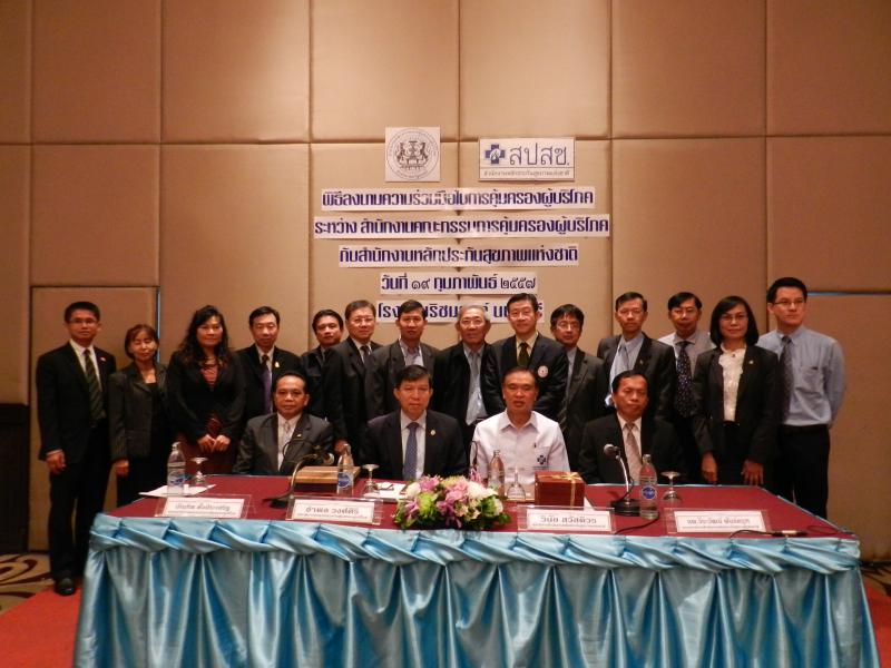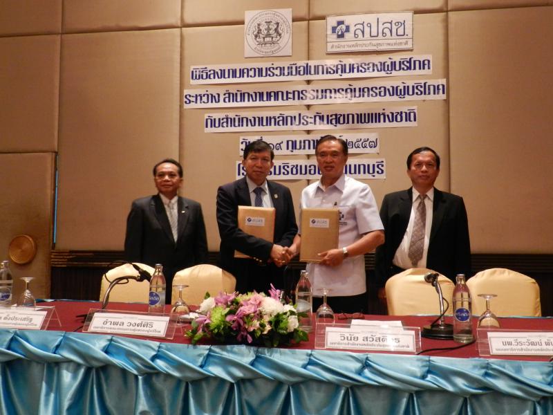 ลงนามบันทึกความร่วมมือในการคุ้มครองผู้บริโภค กับนายแพทย์วินัย สวัสดิวร เลขาธิการสำนักงานหลักประกันสุขภาพแห่งชาติ ณ ห้องทิพวรรณ ๒ โรงแรมริชมอนท์ ถนนรัตนาธิเบศธ์ จังหวัดนนทบุรี เพื่อพัฒนาระบบงานคุ้มครองผู้บริโภคให้มีประสิทธิภาพและเพื่อส่งเสริมและสนับสนุนการคุ้มครองผู้บริโภคให้ครอบคลุมทุกเครือข่าย ภายใต้ภารกิจของหน่วยงานทั้งสอง คือ สร้างและพัฒนาเครือข่ายด้านการคุ้มครองผู้บริโภคให้กว้างขวางและร่วมกันดำเนินกิจกรรมเกี่ยวกับการคุ้มครองผู้บริโภคอย่างต่อเนื่อง สนับสนุนให้มีการพัฒนาศักยภาพของบุคลากรและเครือข่ายด้วยการจัดฝึกอบรมแลกเปลี่ยนข้อมูลคุ้มครองสิทธิ สนับสนุนและพัฒนาระบบฐานข้อมูลเพื่อการแจ้งเตือนสินค้าหรือบริการที่อาจก่อให้เกิดอันตรายต่อสุขภาพผ่านศูนย์บริการในโรงพยาบาล สนับสนุนการศึกษาวิจัย รวมทั้งพัฒนางานวิชาการด้านการคุ้มครองผู้บริโภค ยกระดับมาตรฐานคุณภาพ ด้วยการจัดให้มีระบบการคุ้มครองผู้บริโภค ทั้งในส่วนการประกันคุณภาพ และความปลอดภัยของหน่วยการบริการในโรงพยาบาลเครือข่าย สนับสนุนและสร้างขวัญกำลังใจให้หน่วยงานที่มีผลงานด้านการคุ้มครองผู้บริโภคดีเด่น บันทึกข้อตกลงความร่วมมือนี้ มีกำหนดระยะเวลา 3 ปี