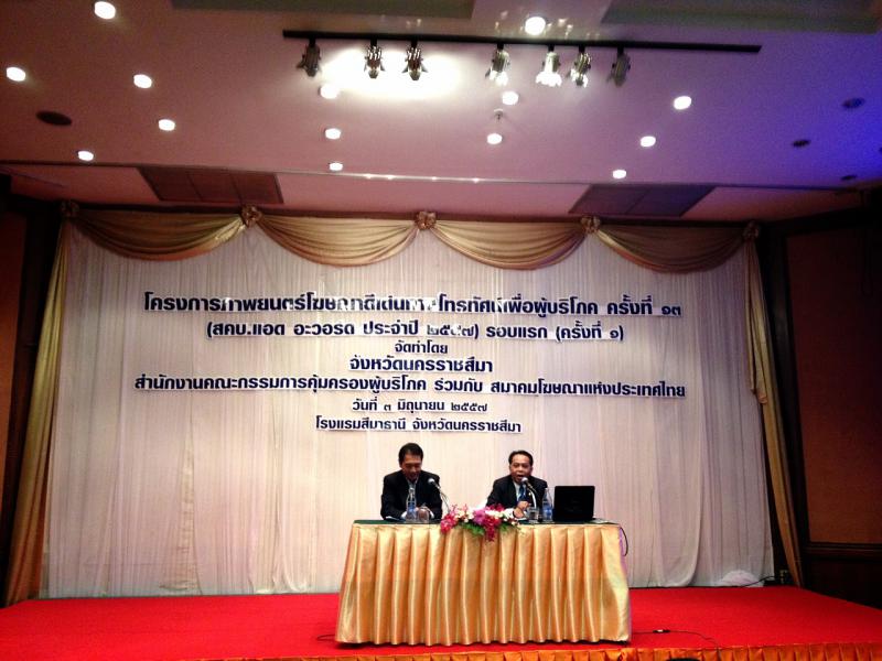 ครั้งที่ 13 (สคบ. แอด อะวอร์ด ประจำปี 2557) รอบแรก (ครั้งที่ 1) จังหวัดนครราชสีมา โดยมีนายธงชัย ลืออดุลย์ ผู้ว่าราชการจังหวัดนครราชสีมา เป็นประธานเปิดงาน