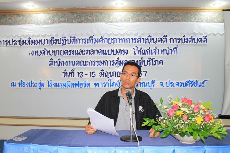 วันที่ 13 – 15 มิถุนายน 2557 สคบ. ประชุมสัมมนาเชิงปฏิบัติการเพิ่มศักยภาพ การดำเนินคดี การบังคับคดี งานด้านขายตรงและตลาดแบบตรง ให้แก่เจ้าหน้าที่ สคบ. ณ ห้องประชุม โรงแรมมิลฟอร์ด พาราไดซ์ อำเภอปราณบุรี จังหวัดประจวบคีรีขันธ์ ทั้งนี้เพื่อเสริมสร้างความแข็งแกร่ง และเพิ่มศักยภาพในการพัฒนาความรู้ด้านกฏหมายคุ้มครองผู้บริโภคและการดำเนินคดีผู้บริโภคให้แก่เจ้าหน้าที่คุ้มครองผู้บริโภคที่ดำเนินงานด้านคดีผู้บริโภค ให้มีความรู้ ความเข้าใจเกี่ยวกับกระบวนการและขั้นตอน ตลอดจนการดำเนินการต่างๆ เกี่ยวกับคดีในศาลเพื่อที่จะดำเนินคดีแทนผู้บริโภคในฐานะเจ้าหน้าที่คุ้มครองผู้บริโภค บรรยายโดยนายอัมพร เหลียงน้อย อัยการอาวุโส สำนักงานอัยการสูงสุด