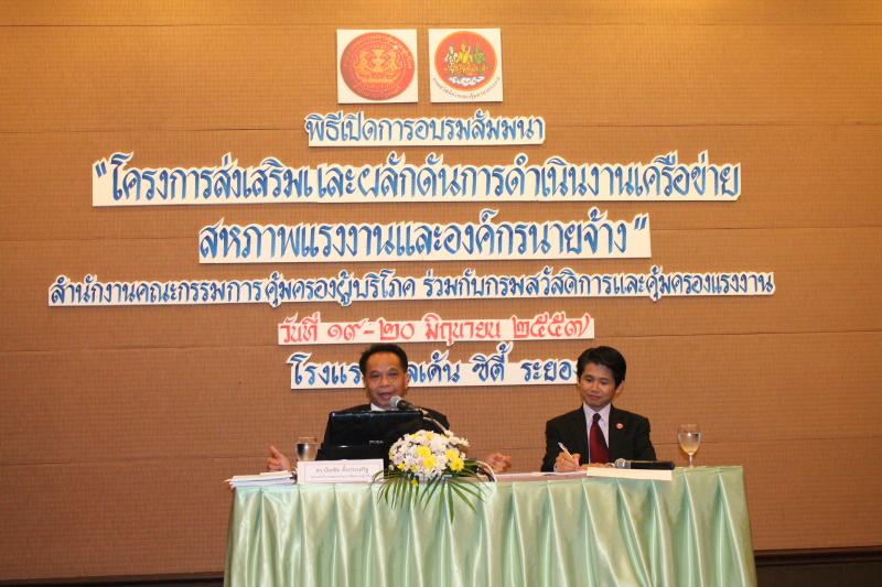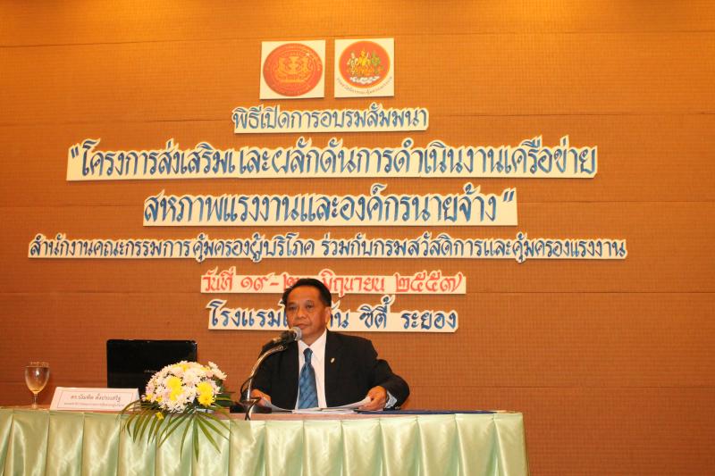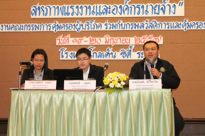 วันที่ 19 มิถุนายน 2557 ดร.บัณฑิต ตั้งประเสริฐ รองเลขาธิการคณะกรรมการคุ้มครองผู้บริโภคเป็นประธานเปิดการสัมมนา"โครงการส่งเสริมและผลักดันการดำเนินงานเครือข่ายสหภาพแรงงานและองค์กรนายจ้าง” ณ โรงแรมโกลเด้น ซิตี้ อำเภอเมืองระยอง จังหวัดระยอง สืบเนื่องจากการทำข้อตกลงความร่วมมือระหว่าง สคบ. กับกรมสวัสดิการและคุ้มครองแรงงานในการ เร่งส่งเสริมให้ภาคแรงงานอุตสาหกรรมมีความรู้ความเข้าใจด้านการคุ้มครองผู้บริโภค เพื่อเป็นการส่งเสริมบทบาทขององค์กรภาคเอกชนและภาคประชาชนให้ควบคู่ไปกับองค์กรภาคราชการ ในการพัฒนาศักยภาพ ของประชาสัมคมและชุมชนท้องถิ่นให้เกิดการรวมกลุ่มที่มีความเข้มแข็ง สามารถพิทักษ์ปกป้องสิทธิ และผลประโยชน์ของตนเองและสังคมไทย ไม่ให้ถูกเอารัดเอาเปรียบจากการซื้อสินค้าหรือบริการ ซึ่งเป็นการส่งเสริมสนับสนุนให้ประชาชนผู้บริโภคได้เข้าใจและเห็นความสำคัญในสิทธิผู้บริโภค เพราะในการคุ้มครองผู้บริโภคในภาคส่วนต่างๆ กลุ่มสหภาพแรงงานนับเป็นกลุ่มพลังที่มีความเข้มแข็ง และสามารถเป็นเครือข่ายด้านการคุ้มครองผู้บริโภคเป็นอย่างดี